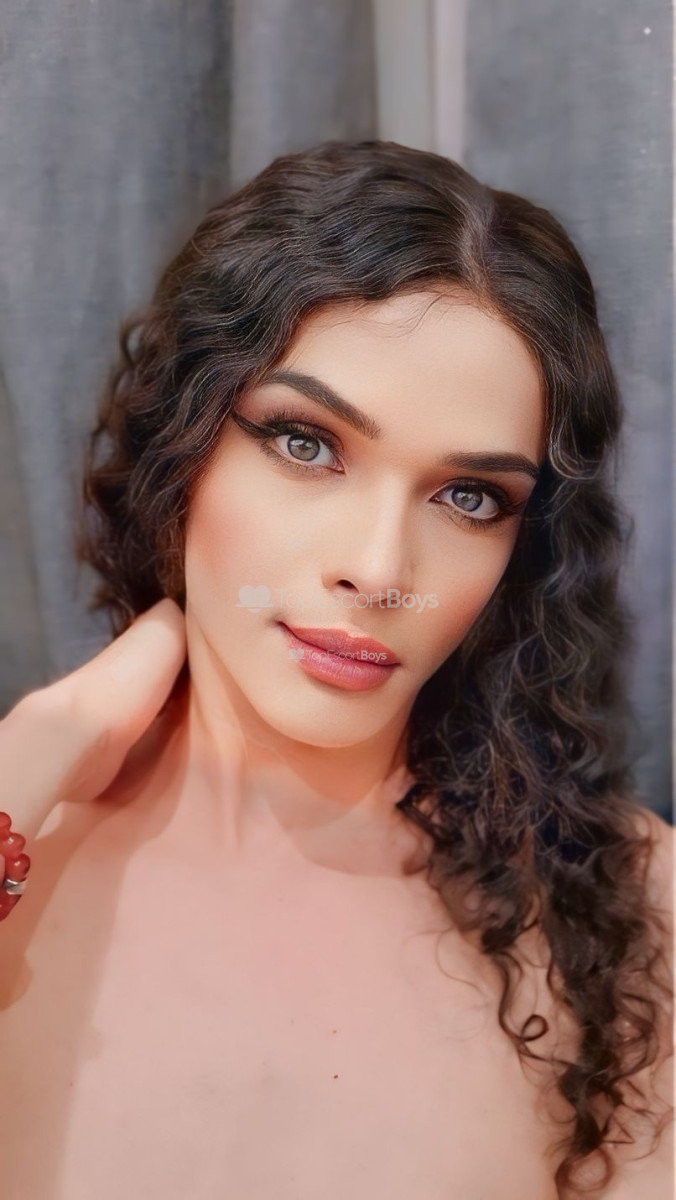 Meet Belle, a captivating trans woman with chestnut and striking green eyes.